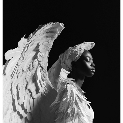 In Ascension in Alabaster, the subject is more than a figure with wings; she is a metaphor for transcendence. This piece from Elegance Enshrined: The Legacy Collection captures the moment of ascension, symbolizing the rise from adversity and the flight towards a higher state of being. The stark contrast of light and shadow plays on the ethereal quality of the wings, while the subjects poise and upward gaze invoke a feeling of serene movement and hopeful departure. <br> <br> Crafted with a monochromatic palette, the artwork aims to strip away the distractions of color to focus on the essence of upliftment. It is a celebration of the power within, a visual representation of the souls journey towards enlightenment and empowerment.